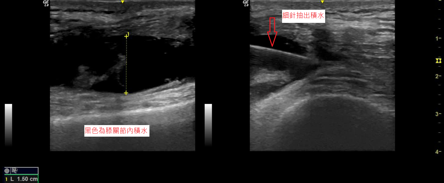膝痛的患者,超音波下發現膝關節積水,在超音波導引下將積水抽出。