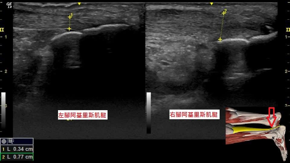 【圖4】腳後跟疼痛半年的患者,超音波發現後腳筋(阿基里斯肌腱)腫脹合併撕裂傷。
