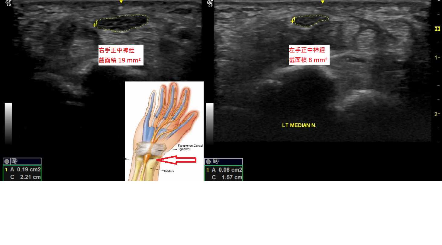 【圖5】手麻的患者,超音波發現手部正中神經腫脹(腕隧道症候群)。