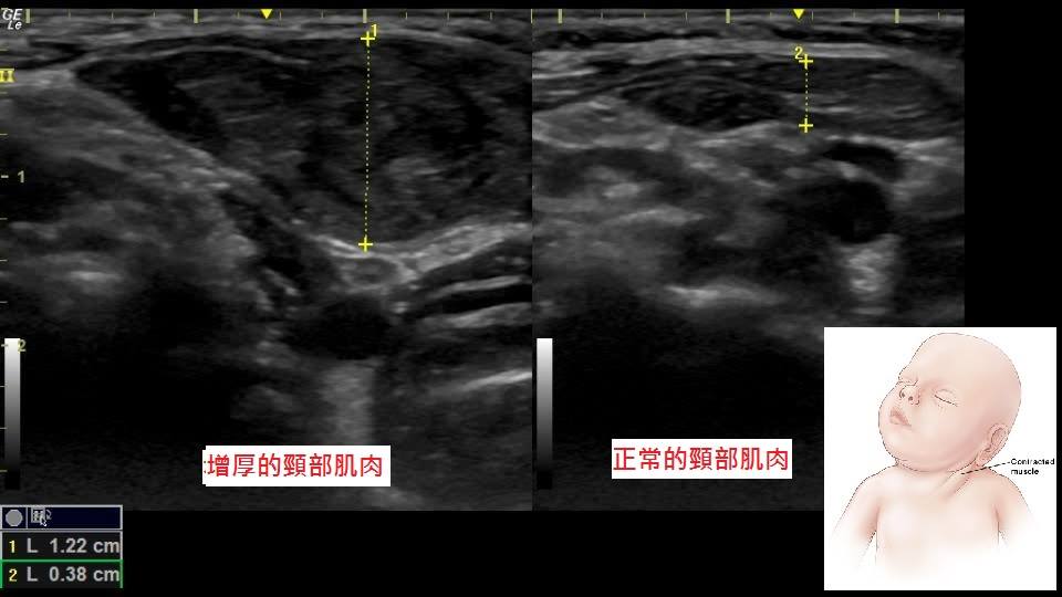嬰兒斜頸,超音波下可以發現頸部肌肉肥厚,是正常側肌肉的3倍大。